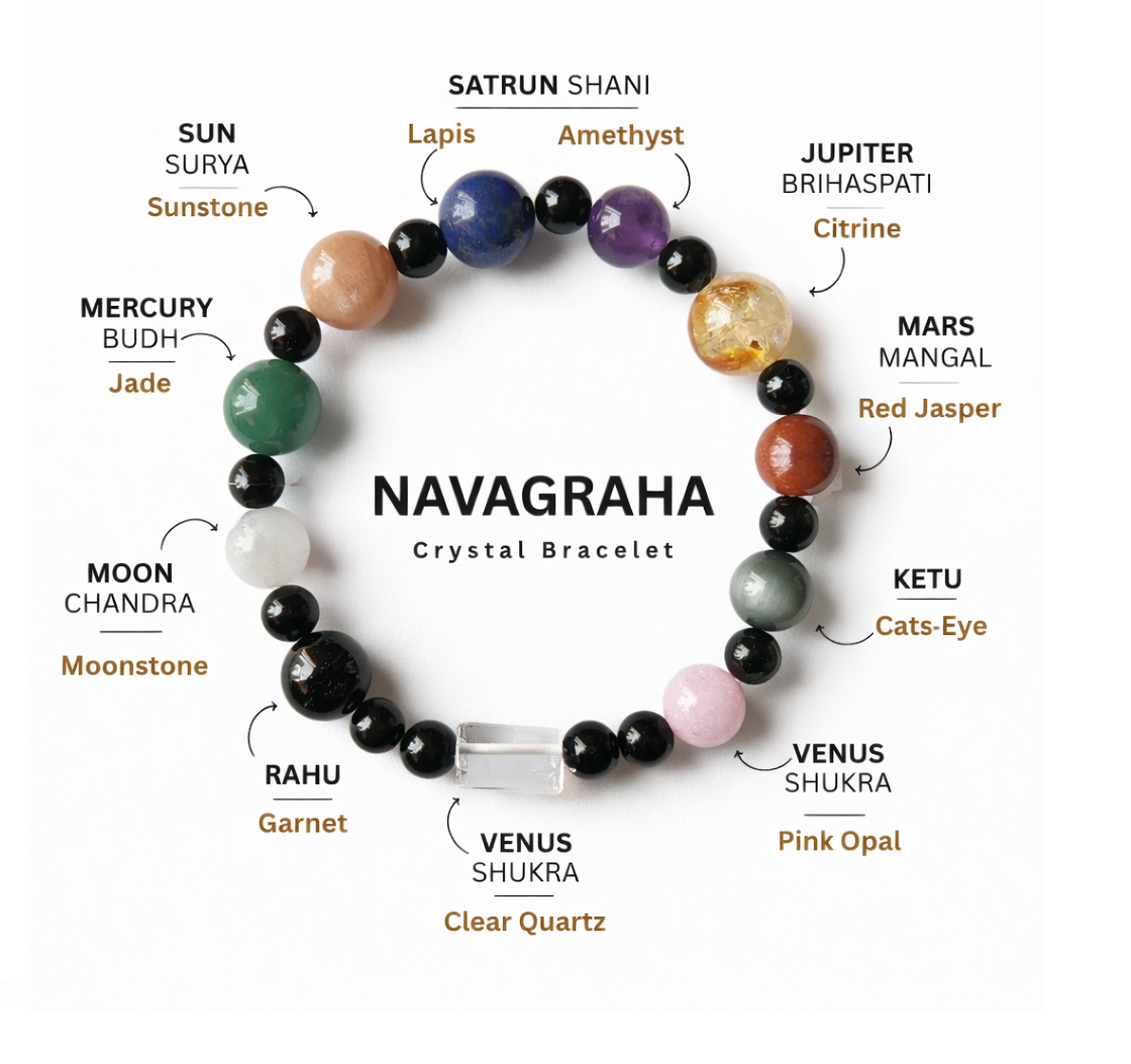 This Navratna Bracelet is crafted with nine carefully selected semi-precious stones, each corresponding to one of the nine planetary energies. It is especially beneficial when multiple planets are adversely placed in a horoscope, or when accurate birth details are unavailable—making individual gemstone remedies uncertain. In such cases, this all-inclusive bracelet serves as a complete planetary harmonizer. Each stone is placed according to its planetary significance to create energetic balance and protection.
